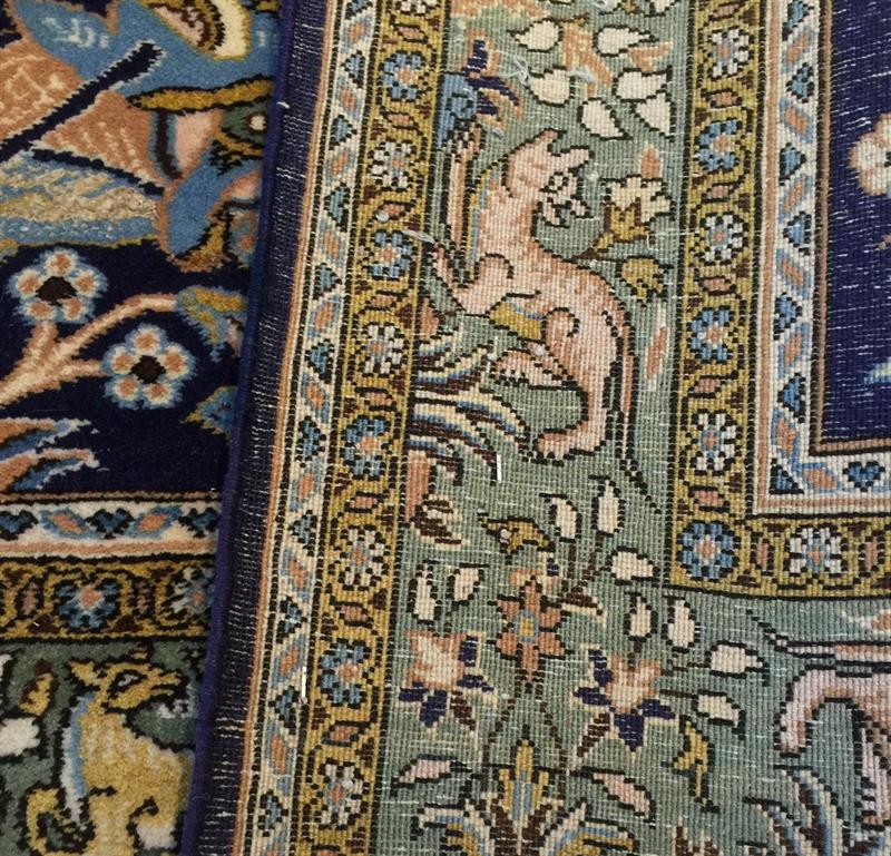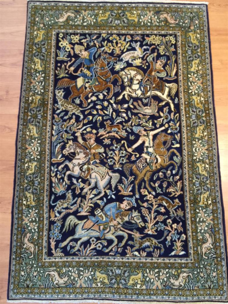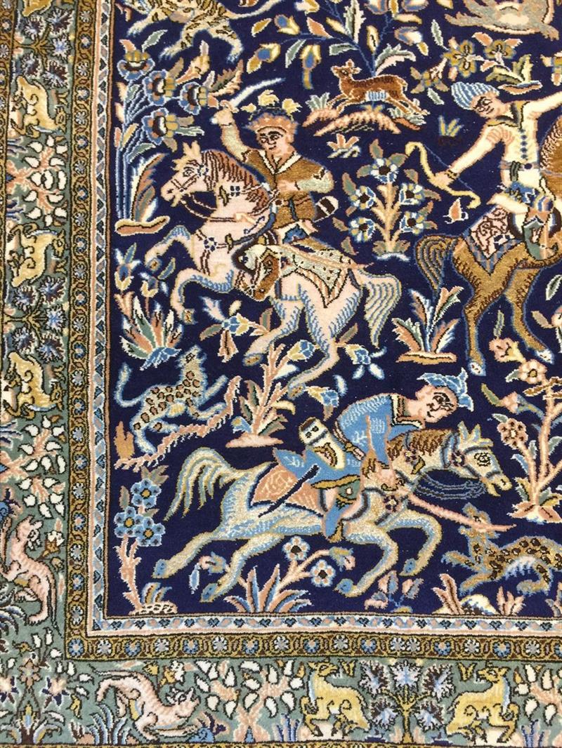 Unikt, rundt 70 år gammel, teppet fra Qom distriktet i Iran i str. 161×106, med jakt motiv. Luven på teppet er i ull og silke, og knyttet på bomull renning.